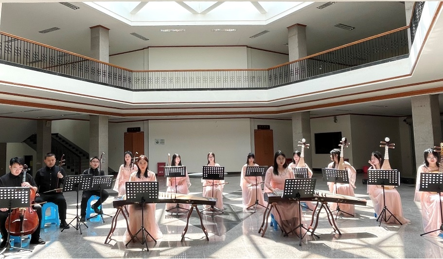 艺术团民乐队由王真珍、李文婷、李正菲、陈钰洁、俞玉洁、郑瑞婷、李璇、姚颖、卢晓薇、蔡宗成、江钰锟、林汝熙十二位成员组成,文艺教研部的黄怀宇、魏雅芳、翁佳仪、庄达宏四位老师倾情指导,共同完成民乐合奏《雨碎江南》。