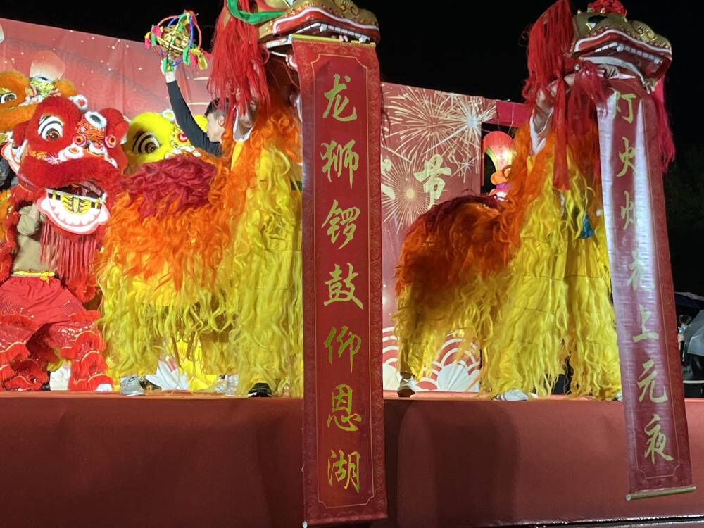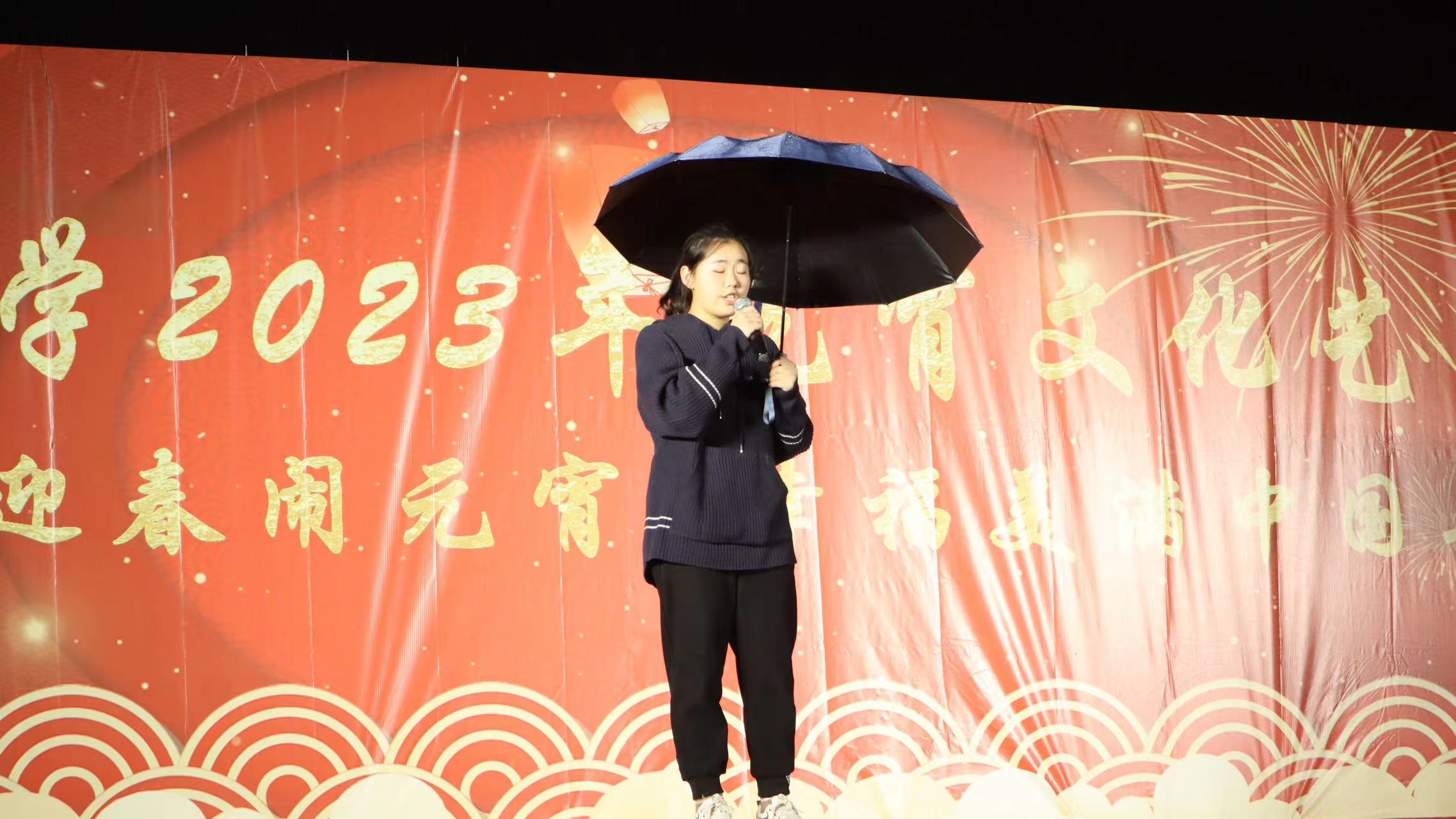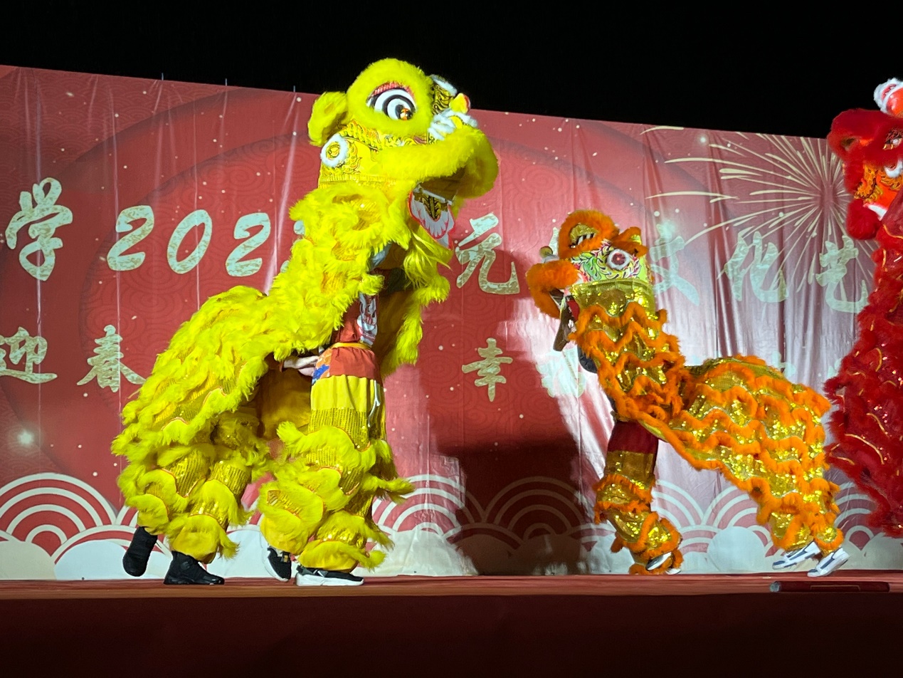 晚风轻拂,细雨绵绵。晚会在龙狮队的一场“龙腾狮悦”中拉开序幕。上下翻飞的龙与狮,龙腾狮跃,寓示着一年喜庆好运,祥和安康。落幕时的对联也满含着与全校师生共赴佳节的喜悦。