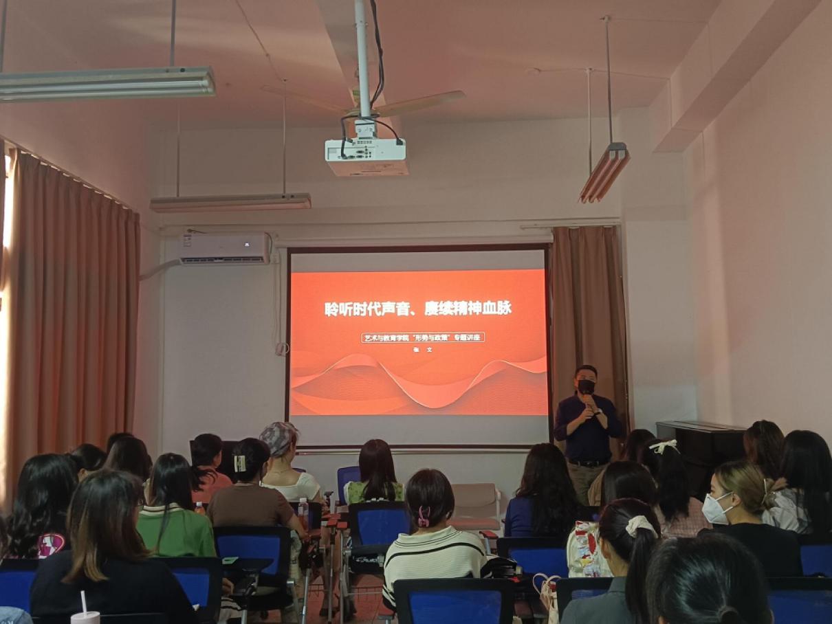 在党的各个历史时期,广大音乐教育工作者和文艺工作者为适应形势需要,创作出大量鼓舞人心,深受欢迎的优秀红色音乐作品。为深入学习这些优秀作品和精神,yl23455永利集团于2023年5月25日下午16:25在旧图404教室举办“聆听时代声音、赓续红色血脉”为主题的音乐党课。由yl23455永利集团党支部书记张文主讲。