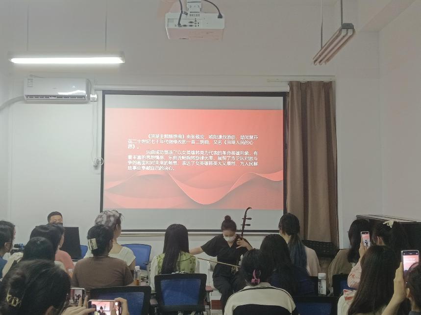 在第二环节,艺教师生们带来了红色音乐作品欣赏。首先由庄钧茹和黄海妍同学分别演奏钢琴曲《兰花花的故事》和《陕北民歌变奏曲》,让同学们感受到陕北民歌的红色韵味,随后黄怀宇和翁佳仪老师分别用竹笛和二胡演奏了《红梅赞》和《洪湖主题随想曲》,用音乐叙述了革命先烈们大义凛然、坚贞不屈的精神,让同学们明白如今的和平幸福生活来之不易。在演奏完各自的曲目后,老师和同学们也对自己表演的音乐作品的背景和风格进行解读,使同学们更加深刻地感悟这些优秀作品。
