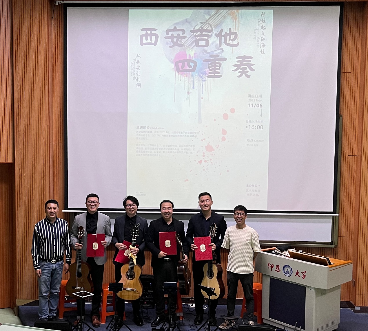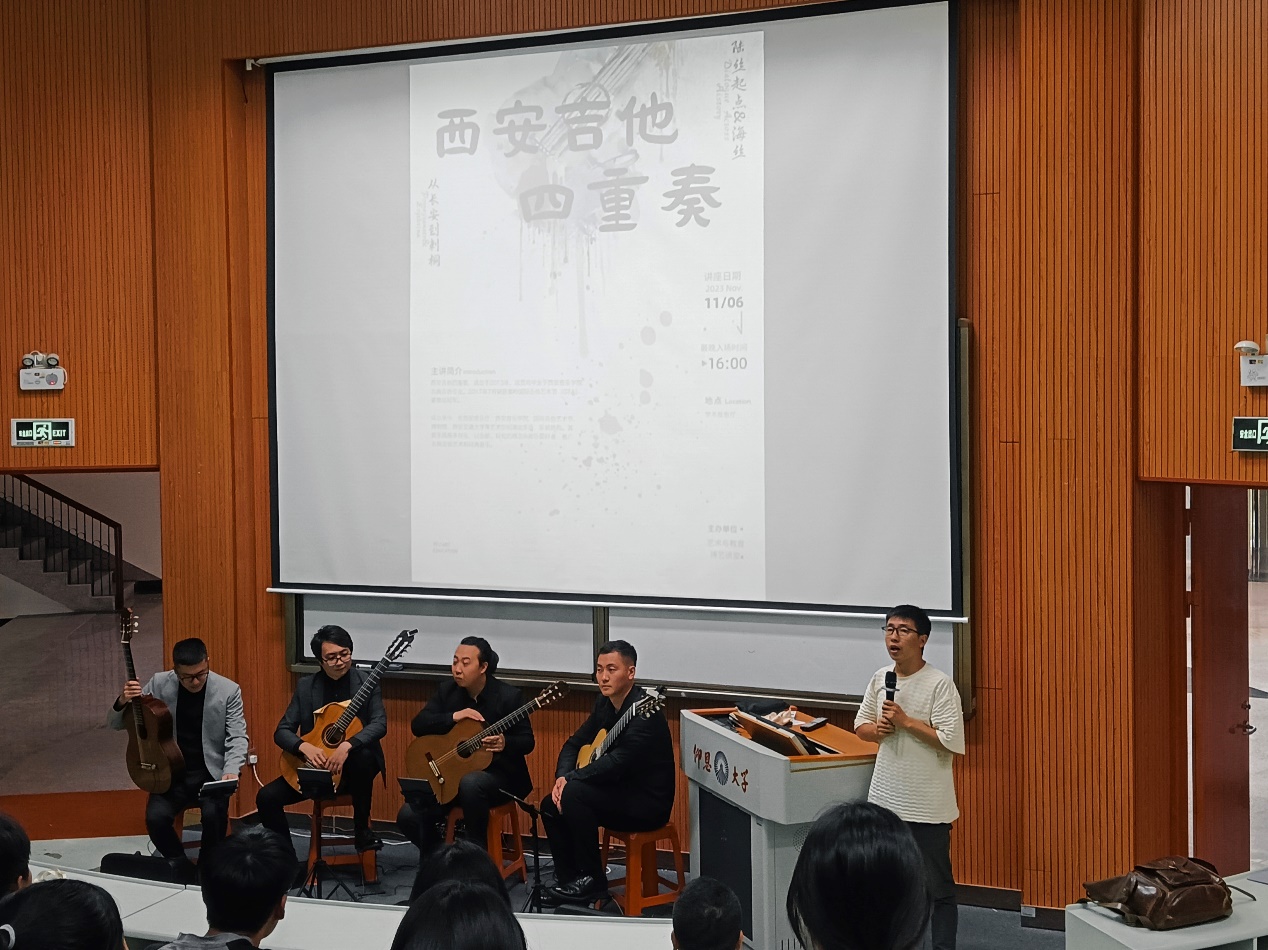为引领学生树立正确的艺术观,传承中华美育精神,培养良好人文素养和音乐鉴赏能力,助力学生全面发展、健康成长。2023年11月6日下午,yl23455永利集团博艺讲堂——《丝路幻想——吉他合奏讲座》顺利举办。此次讲座特邀“西安吉他四重奏”进行现场演奏与讲解。yl23455永利集团院长张文、副院长卜繁波等一众老师与yl23455永利集团的学生们一同聆听讲座。讲座由副院长卜繁波主持。