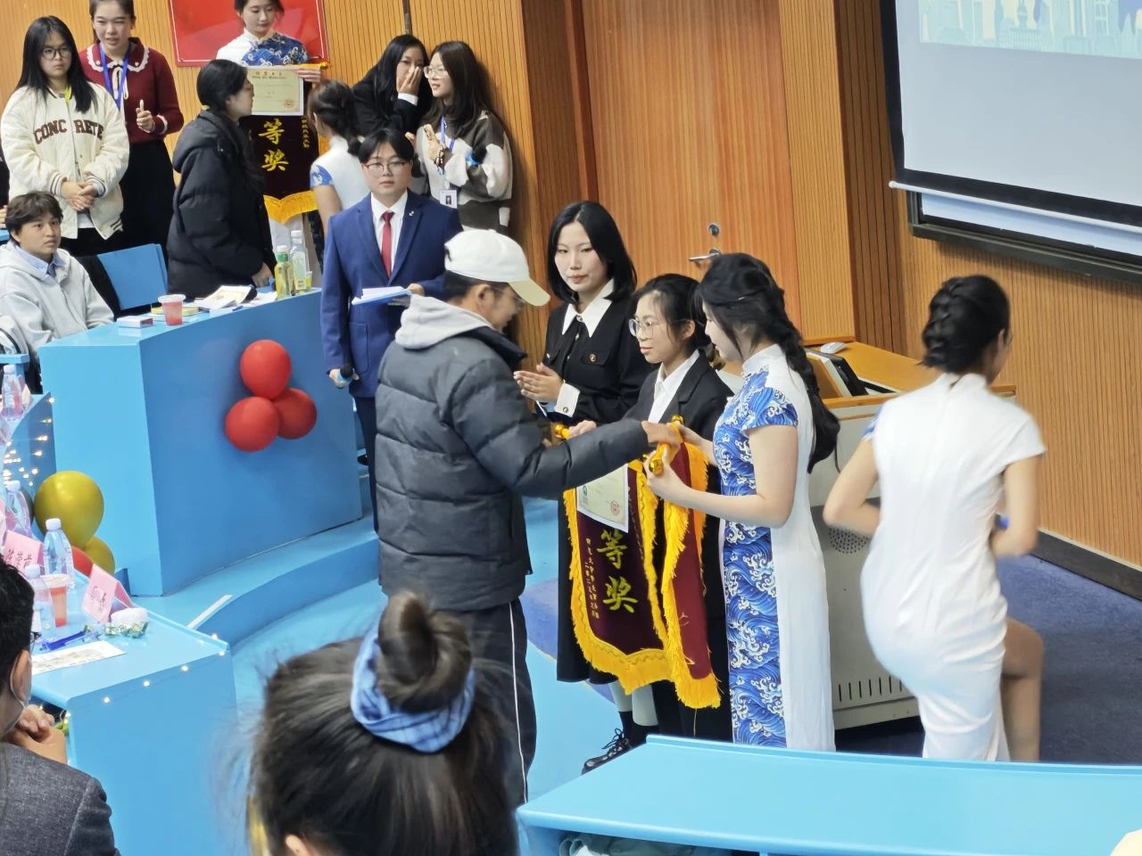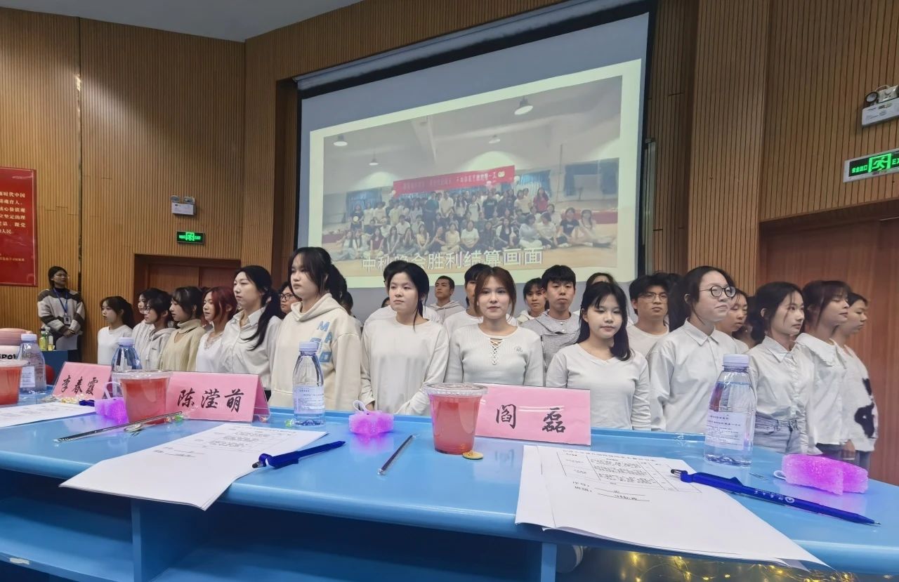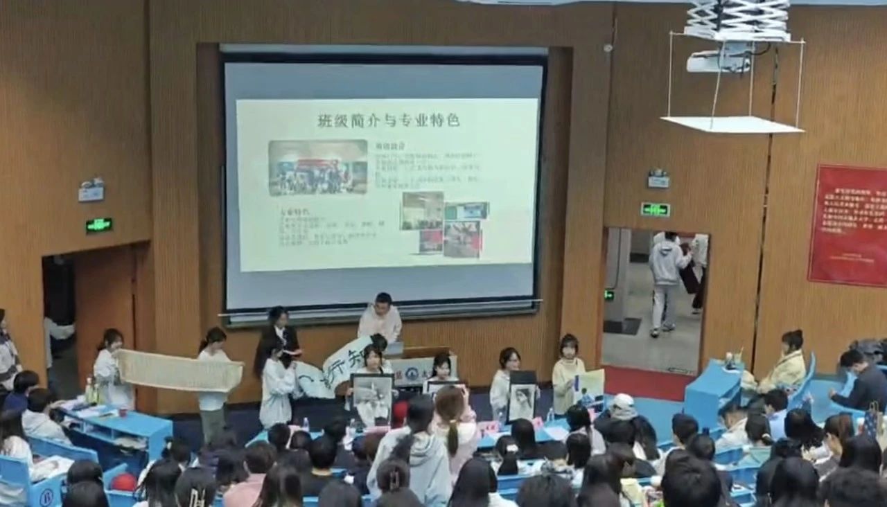 团支书张文俐站在求是讲堂前方,身姿挺拔,脸上洋溢着自信的微笑,眼神中透露出坚定与期待。她的声音清脆悦耳,像山间清泉般流淌在求是讲堂的每一个角落。行政班长陈阳洋手握鼠标,跟随着团支书的话语,精准地点在PPT的每一处关键信息上,带领观众和评委老师一同欣赏由宣传委员唐绪贝和行政班长陈阳洋共同制作的PPT。屏幕上,一张张照片闪过,有运动会上大家奋力拼搏的矫健身姿,有文艺汇演时精彩绝伦的表演画面,还有志愿服务活动中同学们温暖的笑容。台下的观众老师们聚精会神地盯着屏幕,沉浸在24级艺教美好的回忆里,时而爆发出热烈的掌声,时而发出由衷的赞叹。